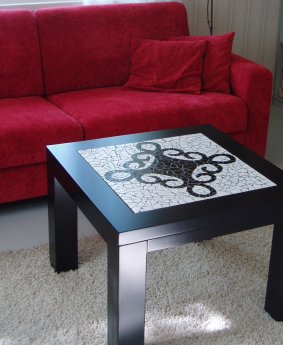 Koivurunkoisia pöytiä mosaiikkikannella.