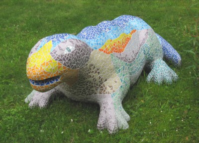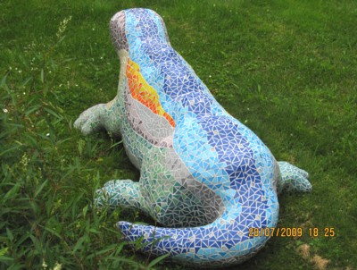 Tilaustyönä valmistettu lisko suihkulähde. Pituus 130cm x korkeus 50cm.